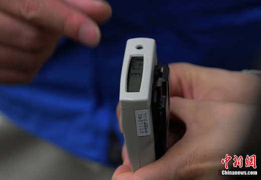 4月26日,日本“3.11”地震海嘯引發核危機重災區的福島縣南相馬市飯館村,工作人員查看隨身攜帶的核輻射劑量檢測儀,目前一切指標尚屬正常范圍,這里已經劃作核災難疏散避難區。中新社記者 賈國榮 攝