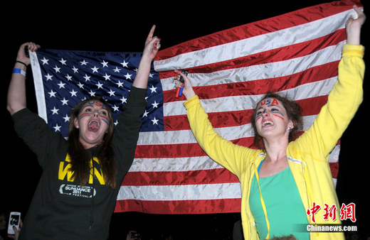 美國(guó)總統(tǒng)奧巴馬1日晚突然召開記者會(huì),正式宣布基地組織頭目本·拉登已經(jīng)死亡。在奧巴馬發(fā)表演講前后,許多美國(guó)民眾已高舉國(guó)旗聚集到白宮附近,他們高呼口號(hào),慶祝拉登之死。 中新社記者 德永健 攝