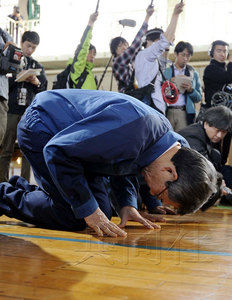 東電社長清水正孝4日下午前往二本松市體育館的安置點,向災民下跪道歉。(共同社)
