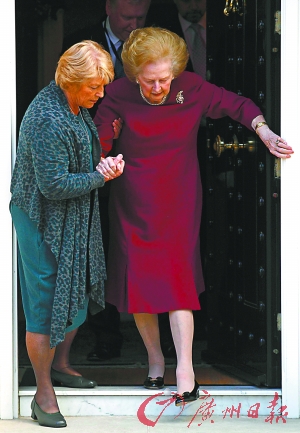 2010年11月,剛出院的撒切爾夫人在他人的攙扶下,首度公開露面。