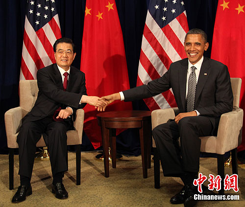 當(dāng)?shù)貢r間11月12日下午,中國國家主席胡錦濤在夏威夷州首府檀香山會見美國總統(tǒng)奧巴馬。中美兩國元首十天之內(nèi)再次會晤。中新社發(fā) 張朔 攝