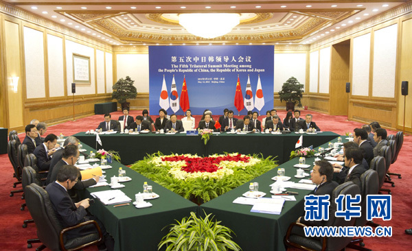 5月13日,第五次中日韓領(lǐng)導(dǎo)人會(huì)議在北京人民大會(huì)堂開(kāi)始舉行。中國(guó)國(guó)務(wù)院總理溫家寶主持會(huì)議,韓國(guó)總統(tǒng)李明博、日本首相野田佳彥與會(huì)。新華社記者 張鐸 攝