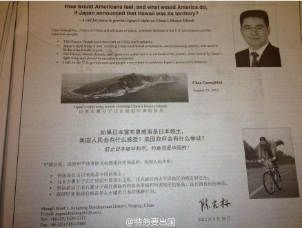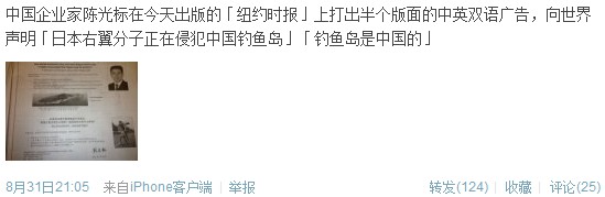 中國企業家、江蘇黃埔再生資源利用有限公司董事長陳光標在31日的美國《紐約時報》上登出半版廣告, “鄭重向美國政府、美國人民聲明”,釣魚島自古以來就是中國的領土。