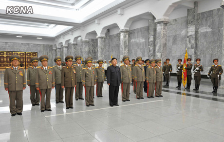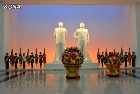 金正恩步入立有金日成和金正日立像的大廳。朝鮮人民軍陸軍、海軍、航空與防空軍及工農赤衛隊儀仗隊隊長向立像做了迎接報告。首先,以金正恩的名義向立像敬獻花籃。人民武力部接著敬獻了花籃。金正恩同全體成員一起向金日成和金正日表示崇高的敬意。
