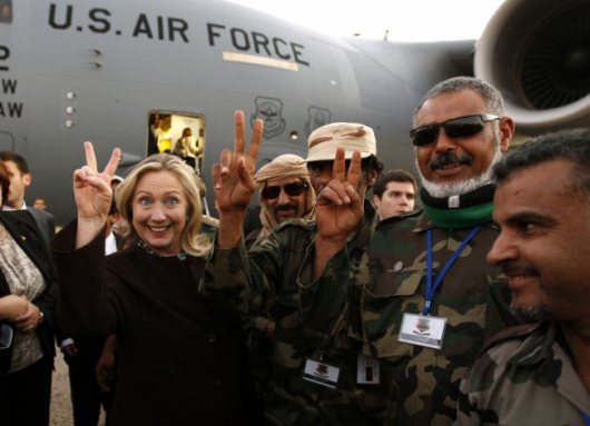 2011年10月,希拉里與利比亞戰士一起比出勝利的“V”字手勢