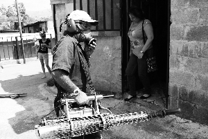 28日,在哥斯達黎加首都圣何塞,一名衛生部門員工對當地居民房屋進行滅蚊消毒。新華社發