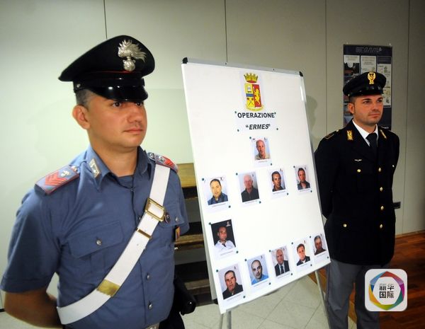資料圖片:2015年8月3日,意大利警方在新聞發(fā)布會上展示逮捕的11名黑手黨成員照片。(圖片來源:新華/美聯(lián))