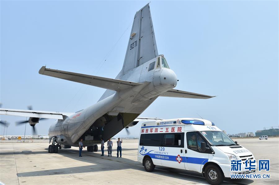 4月17日,海軍巡邏機轉運重病工人抵達三亞鳳凰機場。當日,一架正在南海執行空中巡邏任務的海軍巡邏機緊急飛赴南沙,降落在永暑礁機場,將李萬美等3名重病工人轉運至海南三亞425醫院接受救治。新華社發(高宏偉 攝)