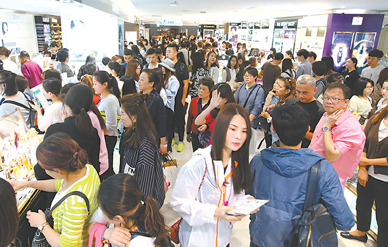 圖片說明:1日,韓國首爾一大型免稅店內擠滿了中國游客。