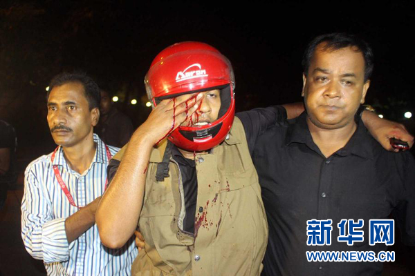 7月2日凌晨,在孟加拉國首都達卡,人們轉移襲擊事件中的受傷警察。新華社發