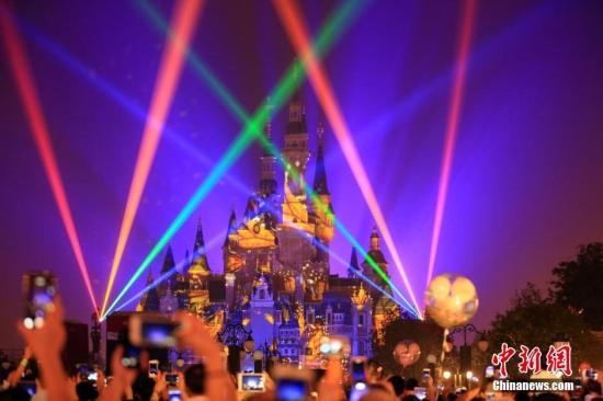 6月16日晚,美輪美奐的燈光煙花秀讓上海迪士尼城堡變得幻彩無比,成當日上海迪士尼開園最華美絢麗的表演之一,吸引數萬游客觀賞。中新社記者 潘索菲 攝