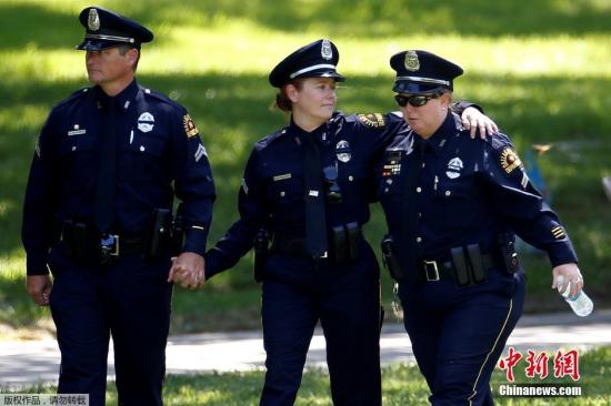 資料圖:當?shù)貢r間2016年7月13日,美國達拉斯,此前在槍擊事件中遇難的警察葬禮舉行。7月7日,在達拉斯舉行的反警察執(zhí)法暴力和種族歧視活動期間,一名男子向警察射擊,導致5名警察死亡,7名警察和2名平民受傷。