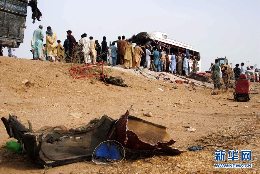 8月2日,在巴基斯坦南部信德省賈姆舒魯地區(qū)的一條公路上,巴基斯坦人聚集在車禍現場。巴基斯坦南部信德省2日上午發(fā)生一起客車與拖車相撞事故,造成至少12人死亡、30人受傷。 新華社發(fā)