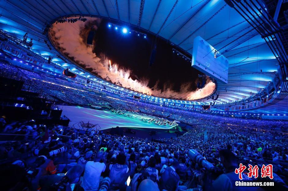 當地時間8月5日晚8時,2016里約奧運會開幕式在里約熱內盧馬拉卡納體育場舉行。圖為開幕式現場表演。中新網記者 盛佳鵬 攝