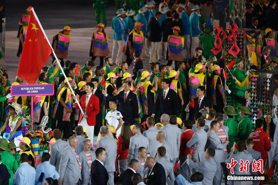 當?shù)貢r間8月5日晚8時,2016里約奧運會開幕式在里約熱內(nèi)盧馬拉卡納體育場舉行,各國代表團入場。圖為中國代表團入場,雷聲擔(dān)任旗手。中新網(wǎng)記者 盛佳鵬 攝