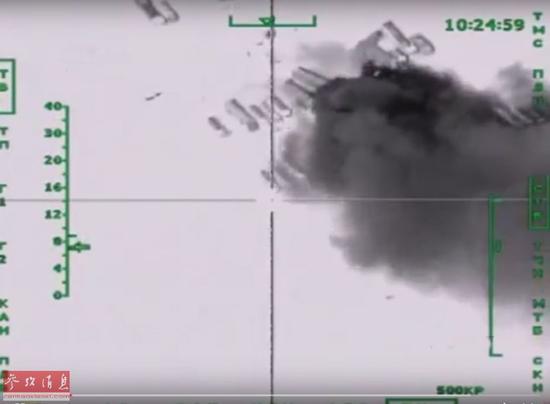圖為俄國防部最新公布的俄空軍11月18日空襲敘境內(nèi)恐怖組織目標的視頻截圖,圖為遭襲擊的恐怖組織油車。