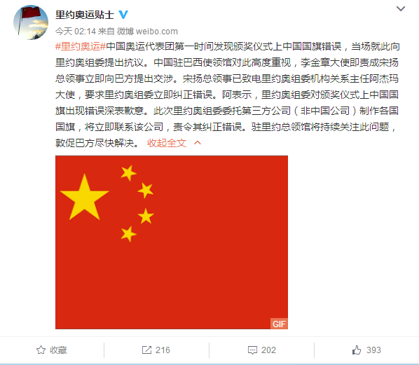 中國駐里約熱內盧總領館官方微博8日凌晨發布消息稱,中國奧運代表團第一時間發現頒獎儀式上中國國旗錯誤,當場就此向里約奧組委提出抗議。中國駐巴西使領館對此高度重視,李金章大使即責成宋揚總領事立即向巴方提出交涉。宋揚總領事已致電里約奧組委機構關系主任阿杰瑪大使,要求里約奧組委立即糾正錯誤。阿表示,里約奧組委對頒獎儀式上中國國旗出現錯誤深表歉意。此次里約奧組委委托第三方公司(非中國公司)制作各國國旗,將立即聯系該公司,責令其糾正錯誤。駐里約總領館將持續關注此問題,敦促巴方盡快解決。