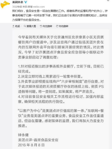 美團點評一首席食品安全官鐘永健通過微博指出,今早看到有關媒體關于北京通州區北京像素小區無資質餐飲商戶的報道中,涉及這些商戶通過包括美團外賣在內的互聯網外賣平臺吸引顧客開展經營的情況。對此情況,今早7時許美團點評食品安全應急領導小組聯動外賣事業部啟動了調查處理: