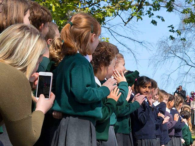 資料:4月20日,溫莎,一隊(duì)學(xué)生在歡迎儀式上向英國(guó)女王(未在畫面上)致意。