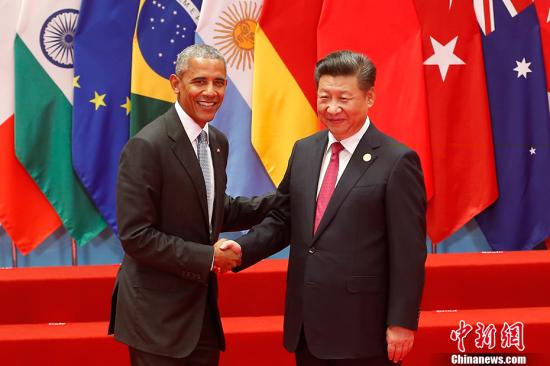 9月4日,二十國集團領導人第十一次峰會在杭州國際博覽中心舉行。 圖為習近平同美國總統奧巴馬握手。中新社記者盛佳鵬攝