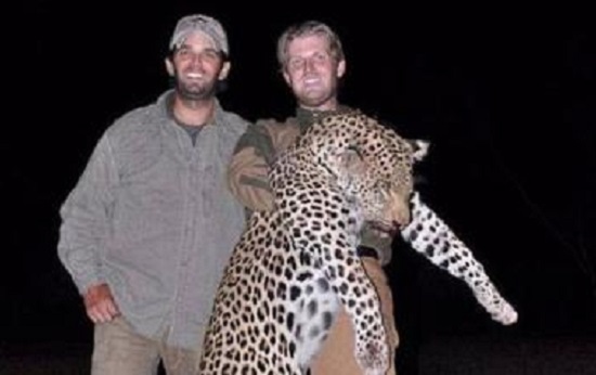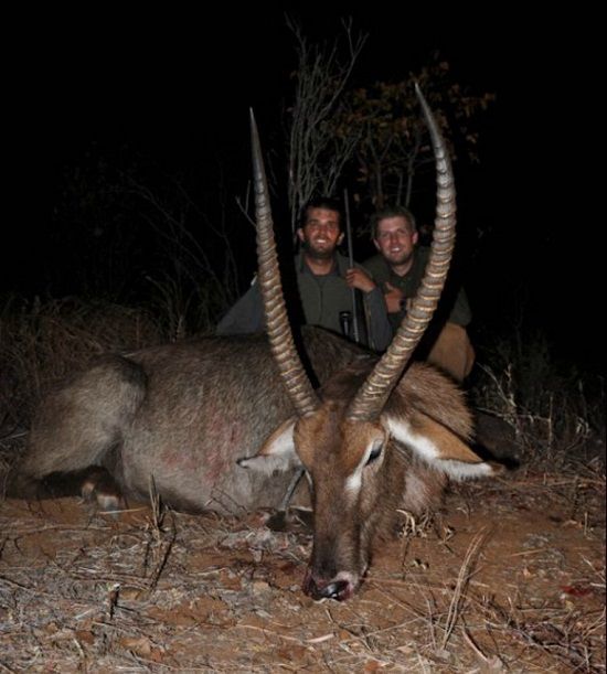 此前,我們經常可以通過特朗普的兩個兒子(小唐納德Donald Jr.和埃里克Eric)在社交媒體上的照片看到他們打獵收獲的“戰利品”:其中有一張就是兩個人在非洲獵殺的豹子;另一張是小唐納德拿著一條他剛切下來的大象尾巴;還有則是兩個人微笑著站在美麗的水羚(waterbuck)角中間。