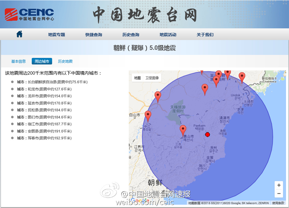 中國地震臺網公布了震中周邊中國縣城的分布情況,其中,距震中最近的地區(qū)為長白山縣,僅有76公里。