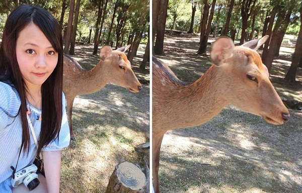 【環(huán)球網(wǎng)綜合報(bào)道】人們都喜歡在網(wǎng)上上傳和分享自己和有趣事物的合影,近日,一張人和小鹿的自拍照在網(wǎng)絡(luò)上爆紅。據(jù)英國(guó)《每日郵報(bào)》9月8日?qǐng)?bào)道,臺(tái)灣一名游客在日本奈良游玩時(shí),與當(dāng)?shù)氐囊恢恍÷拐樟藦埾唷A钊巳炭〔唤氖牵@只小鹿的表情十分到位,向舉著相機(jī)的游客投去了鄙視的眼神,仿佛在表達(dá)不滿。