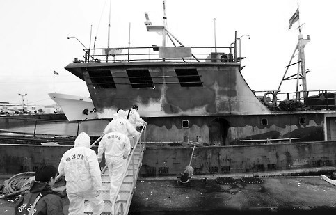 圖說:9月30日,韓方登船調(diào)查發(fā)生火災(zāi)的中國漁船