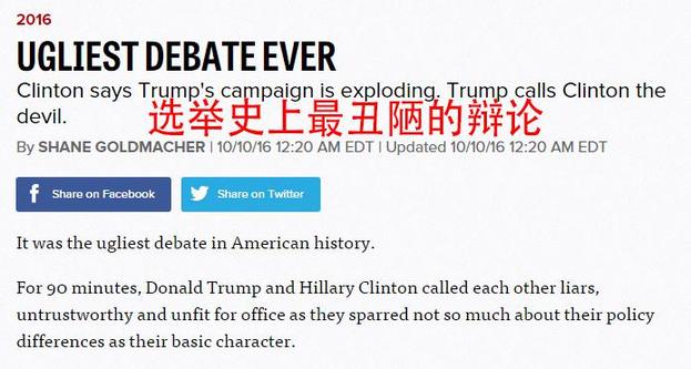 有媒體形容這是“美國選舉史上最丑陋的辯論”。文中指出,在這場90分鐘的辯論中,特朗普和希拉里互相指責對方撒謊,以及如何不值得信賴和不適合總統一職,他們更多地去對對方進行人格攻擊而非談論執政理念的差異。
