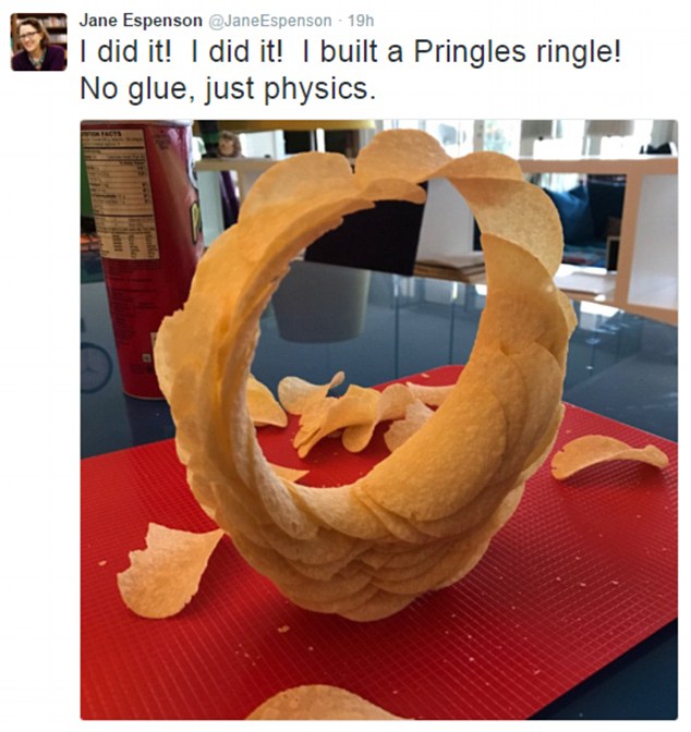 【環(huán)球網(wǎng)綜合報(bào)道】據(jù)英國《每日郵報(bào)》10月25日?qǐng)?bào)道,近日,網(wǎng)絡(luò)上一張圖片被網(wǎng)友們轉(zhuǎn)發(fā)了5萬多次。據(jù)悉,這張圖片由居住在美國洛杉磯的電視編劇珍妮·埃斯彭遜(Jane Espenson)拍攝,內(nèi)容為她用品客薯片搭建的一個(gè)小圓環(huán)。