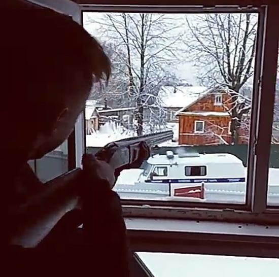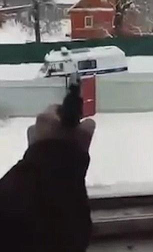 當時警察前往事發的房屋尋找失蹤的少年,一輛警車被暴露在炮火下?言谝曨l中說,因為她的繼父在特種部隊,所以房間里有槍。