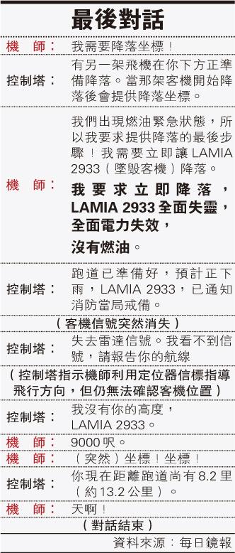 當(dāng)?shù)貢r(shí)間11月28日晚,巴西沙佩科恩斯足球俱樂部的包機(jī)在哥倫比亞安蒂奧基亞省省會(huì)麥德林市國(guó)際機(jī)場(chǎng)附近失事,截至目前造成71人遇難,僅6人幸存。最新曝光的機(jī)長(zhǎng)與麥德林機(jī)場(chǎng)指揮塔臺(tái)的對(duì)話錄音顯示,就在墜毀前數(shù)分鐘,飛機(jī)沒有電力、燃料用盡,機(jī)長(zhǎng)急切請(qǐng)求允許降落。