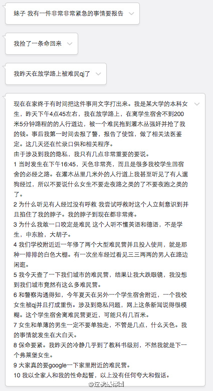 今年11月16日,一名中國女留學生在返回宿舍途中遭遇性侵并向德國警方報案。受害人曾描述說,作案嫌疑人在30到35歲之間,身高1米70,黑色頭發,大胡子,外貌特征似阿拉伯裔或阿富汗裔。