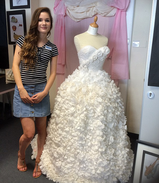 今年16歲的瑞秋·勒弗勒爾(Rachel Lefleur)為參加普通中等教育證書會考(GCSE),從2015年10月開始制作這套婚紗。該婚紗領口呈心形,背部設計為緊身系帶胸衣,裙擺為傘裙,并用一卷白色衛生紙釘、粘、貼上閃閃發光的玫瑰做修飾。整套婚紗精工細作,耗時4個月完工;而成本僅30英鎊,其原材料——19卷衛生紙僅僅花了10英鎊(約合人民幣83.3元)。