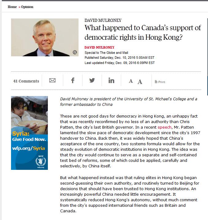 【環球網報道 記者 余鵬飛】加拿大前駐華大使馬大維(David Mulroney)12月10日在《環球郵報》撰文指責英國和加拿大等國并沒有出面批評中國政府的香港政策,并建言加拿大支持香港的“民主運動”。