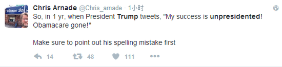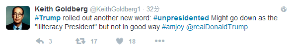 網友Keith Goldberg:特朗普又整出了一個新詞兒——很不總統(unpresidented)。這可能讓這個“文盲總統”留名史冊,但真不是個好辦法。