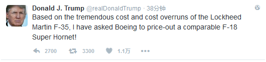 “基于洛馬公司的F-35價格過于昂貴以及預算嚴重超支的原因,我和波音談了,給我一個可與F-35‘匹敵’的F-18超級大黃蜂的報價。”