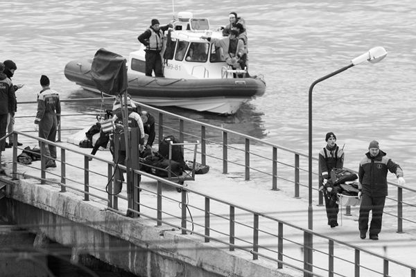 25 日,在俄羅斯索契黑海水域,搜救團隊將 遇難者遺體抬上岸。