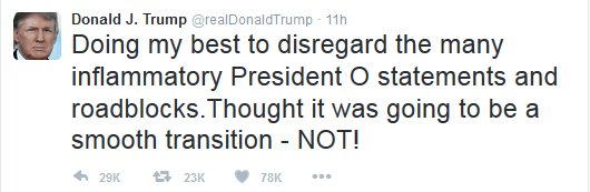 之前奧巴馬在接受采訪時(shí)宣稱,如果自己能夠第三次參選總統(tǒng),特朗普鐵定沒戲。這可惹毛了特朗普。他連續(xù)幾天發(fā)推文,怒火直指奧巴馬。在最新的推文中,特朗普說道:“我已經(jīng)盡我所能不去理睬奧巴馬總統(tǒng)很多煽動(dòng)性的言論還有設(shè)置的障礙。我本以為能夠?qū)崿F(xiàn)平穩(wěn)過渡——異想天開!”