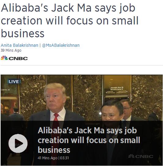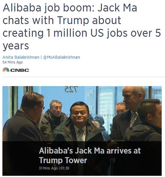 起初,CNBC援引消息人士的話稱(chēng),馬云此次會(huì)見(jiàn)特朗普,主要是聊阿里巴巴最新的美國(guó)擴(kuò)張計(jì)劃。這份計(jì)劃包括未來(lái)5年在美國(guó)創(chuàng)造100萬(wàn)就業(yè)崗位。CNBC顯然對(duì)此充滿期待,并將這個(gè)點(diǎn)當(dāng)做標(biāo)題。