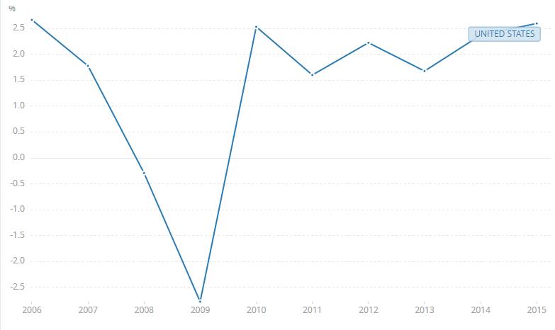 從2009年的-2.776%到2015年2.596%,美國GDP增速顯示經(jīng)濟(jì)在緩慢復(fù)蘇。數(shù)據(jù)來源:世界銀行