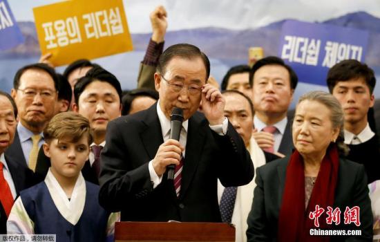 資料圖:當地時間2017年1月12日,韓國仁川,卸任的聯合國前秘書長潘基文返回韓國。在回國之后,潘基文在仁川機場發表對國民信息,他被認為是下屆韓國總統的有力競爭者。