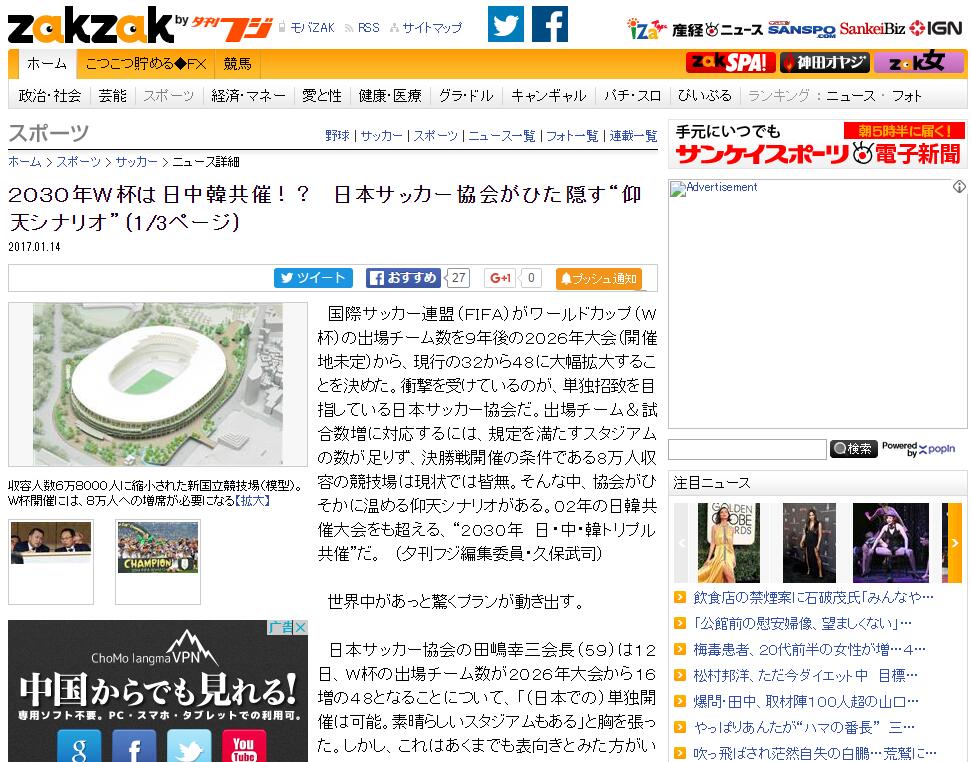 ZAKZAK網站報道還稱,以日本現有的能力,無力單獨申辦世界杯,日本足協主席田島幸三坦言現在要考慮和其他國家一起申辦。在日本輿論看來,中國和韓國無疑是日本最好的聯合申辦伙伴。韓國在2002年和日本一起承辦過世界杯,中國則具有經濟實力,而且申辦世界杯的意愿強烈。