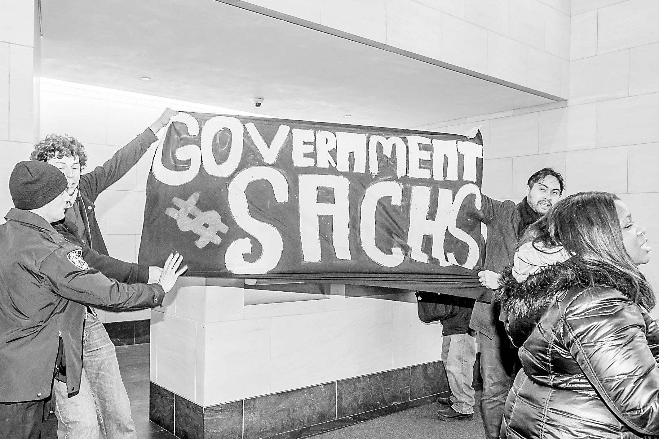 圖說:本月初,高盛集團位于紐約的辦公地點,一些活動人士抗議高盛在美國政府中施加影響力,圖中的標(biāo)語為“高盛政府”。