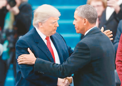 1月20日,在美國首都華盛頓國會山,特朗普(左)與奧巴馬在美國第45任總統就職典禮上握手。