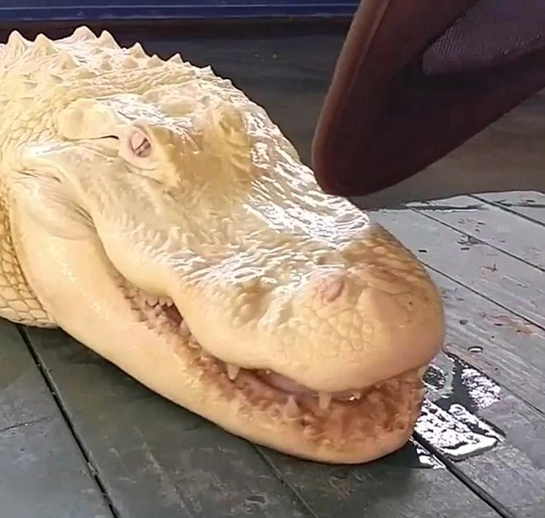鱷魚佩爾長約2.3米,重約48千克,已經10歲了,在鱷魚島主題公園已經生活了7年。拍攝該視頻時,佩爾正好因為飼養員用帽子碰了它的鼻子調笑它而冒出水面,試圖奪回這頂帽子。它并沒有顯得無精打采,粉色的眼睛反倒讓人們難以看出它的視線在何方。