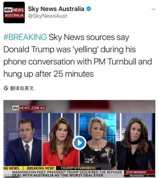 特朗普在推特上“直播批奏”,指名道姓怒斥與澳大利亞達成的難民協議,讓澳大利亞媒體炸了鍋。有媒體爆料稱,早在特朗普發推之前,特朗普和澳大利亞總理特恩布爾就這個協議通過電話,在通話中特朗普是一頓吼(yelling),吼完之后還把電話掛了。