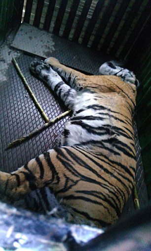 當地村民開著拖拉機壓平農作物,為搜尋老虎開辟道路。護林員騎著大象展開搜尋工作。人們發現老虎時它正在撕咬一名男子,男子失去了一只胳膊和一條腿,并且已經死亡。老虎試圖攻擊村民并逃跑,搜尋人員發射了幾十枚鎮定飛鏢后,老虎才失去意識并倒下。