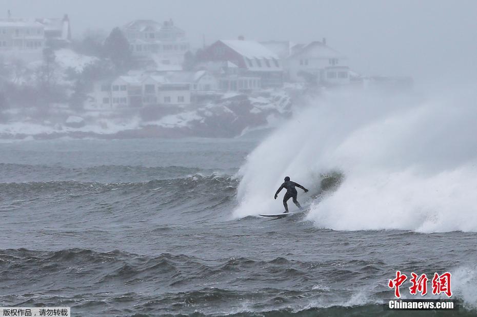 當地時間2月13日,美國馬薩諸塞州持續暴風雪,沖浪者不畏嚴寒在大浪中上下翻飛。