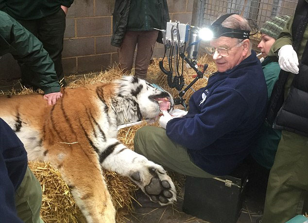 據(jù)英國《每日郵報》2月13日報道,近日,英國牙醫(yī)彼得·凱爾泰斯(Peter Kertesz)為住在英格蘭貝德福德郡沃本野生動物園的老虎埃爾頓(Elton)醫(yī)治受感染的開裂犬齒。據(jù)悉,該老虎為嚴(yán)重瀕危的東北虎,受感染的牙齒若不及時治療將致死。